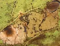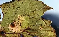 The larvae feed on Vitis aestivalis, Vitis labrusca and Vitis riparia. They mine the leaves of their host plant. The mines are relatively large. No gallery is visible and the mine has the form of a large blotch, with a roundish patch of reddish frass near the beginning, probably attached to the upper epidermis, and dispersed black frass throughout the mine.[2]