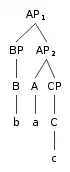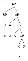 In this tree, the set of pairs of nonterminal categories such that the first member of the pair asymmetrically c-commands the second member is: ⟨BP, A⟩, ⟨BP, CP⟩, ⟨A, CP⟩}. This gives rise to the total ordering: ⟨b, a, c⟩.