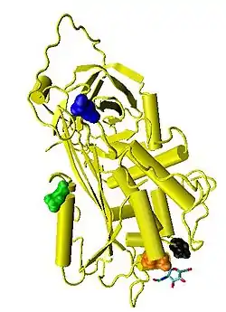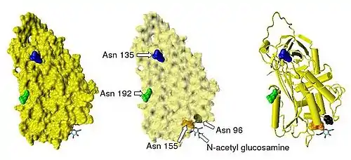 Recombinant antithrombins with properties similar to those of normal human antithrombin have been produced using baculovirus-infected insect cells and mammalian cell lines grown in cell culture.[14][15][16][17] These recombinant antithrombins generally have different glycosylation patterns to normal antithrombin and are typically used in antithrombin structural studies. For this reason many of the antithrombin structures stored in the protein data bank and presented in this article show variable glycosylation patterns.