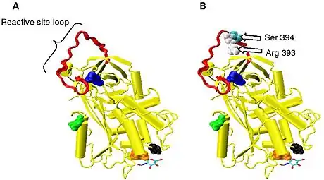 In the absence of heparin, amino acids P14 and P15 (see Figure 3) from the reactive site loop are embedded within the main body of the protein (specifically the top of beta sheet A). This feature is in common with other serpins such as heparin cofactor II, alpha 1-antichymotrypsin and MENT.