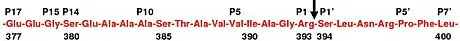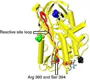 Protease inactivation results as a consequence of trapping the protease in an equimolar complex with antithrombin in which the active site of the protease enzyme is inaccessible to its usual substrate.[12] The formation of an antithrombin-protease complex involves an interaction between the protease and a specific reactive peptide bond within antithrombin. In human antithrombin this bond is between arginine (arg) 393 and serine (ser) 394 (see Figure 2 and Figure 3).[12]