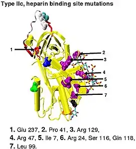 α-Antithrombin and β-antithrombin differ in their affinity for heparin.[35] The difference in dissociation constant between the two is threefold for the pentasaccharide shown in Figure 3 and greater than tenfold for full length heparin, with β-antithrombin having a higher affinity.[36] The higher affinity of β-antithrombin is thought to be due to the increased rate at which subsequent conformational changes occur within the protein upon initial heparin binding. For α-antithrombin, the additional glycosylation at Asn-135 is not thought to interfere with initial heparin binding, but rather to inhibit any resulting conformational changes.[35]