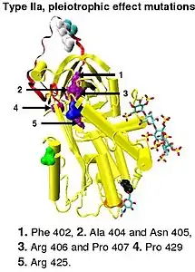 Type I antithrombin deficiency is characterized by a decrease in both antithrombin activity and antithrombin concentration in the blood of affected individuals. Type I deficiency was originally further divided into two subgroups, Ia and Ib, based upon heparin affinity. The antithrombin of subgroup Ia individuals showed a normal affinity for heparin while the antithrombin of subgroup Ib individuals showed a reduced affinity for heparin.[45] Subsequent functional analysis of a group of 1b cases found them not only to have reduced heparin affinity but multiple or 'pleiotrophic' abnormalities affecting the reactive site, the heparin binding site and antithrombin blood concentration. In a revised system of classification adopted by the Scientific and Standardization Committee of the International Society on Thrombosis and Haemostasis, type Ib cases are now designated as type II PE, Pleiotrophic effect.[46]