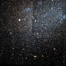 Sextans B is the second largest galaxy in the group, with a diameter of 6,000 light-years. Sextans B is the most distant from Earth in the group, at 4.44 million light-years away. Sextans B has a uniform stellar population,[8] but the interstellar medium in it may be inhomogeneous.[9] Its mass is estimated to be about 2 × 108 times the mass of the Sun, of which 5.5 × 107 is in the form of atomic hydrogen.[8] Star formation in the galaxy seems to have proceeded in distinct periods of low intensity, separated by shorter periods of no activity.[8] The existence of Cepheid variables in the galaxy implies that Sextans B contains at least some young stars.[10] The metallicity of Sextans B is rather low, with a value of approximately Z = 0.001.[8] Sextans B is receding from the Milky Way with a speed of approximately 300 kilometres per second (190 mi/s),[9] and probably lies just outside the edge of the Local Group, so as its neighbour Sextans A.[11]