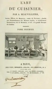 Of humble parentage, Beauvilliers worked his way up from kitchen boy to become the chef of Monsieur, the Count of Provence and future King Louis XVIII. Beauvilliers opened a restaurant called the La Grande Taverne de Londres in the Palais-Royal, Paris, sometimes between 1782 and 1786.[6] The restaurant was intended for a wealthy and aristocratic clientele; it had tables made of mahogany, crystal chandeliers, and tablecloths of fine linen, an extensive wine cellar, and elegantly-dressed waiters.[7] Dishes on the restaurant menu included partridge with cabbage, veal chops grilled in buttered paper, and duck with turnips.[5] The restaurant Beauvilliers became a rendez-vous of conservative political factions, in which Beauvilliers was implicated; in 1795 he was forced to close his establishment and to live away from the trade that was his life. When he reopened La Grande Taverne de Londres, at 26 rue de Richelieu, tastes had changed and he met with less success. The restaurant closed in 1825.[5]