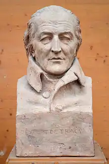 Under the Empire, Tracy was a member of the senate, but he took little part in its deliberations. Under the Restoration, he became a peer of France, but protested against the reactionary split of the government and remained in opposition. In 1808, he was elected a member of the Académie française in place of Cabanis and in 1832 was also named a member of the Academy of Moral Sciences on its reorganization. He appeared only once at its conferences, owing to his age and to disappointment at the comparative failure of his work. Destutt de Tracy was one of the principal advocates of liberalism during and after the Revolution. He died in Paris.[1]