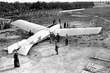 The spars were supported by ribs spaced 40 cm apart; the wings, fully loaded, were designed to bear about 25 kg per m2 — when the current aircraft of the time only were designed to bear 15 kg/m2. The chord of each wing was 4 metres at the junction with the fuselage, and decreased to 3 metres at the wing tip. The upper side of the wing's airfoil was cambered, while the under side was very flat, with the leading and trailing edges being quite sharp.[2][3][4] The tailplane included a long, low fin and a large rectangular rudder that could be enlarged by an extension.[5]