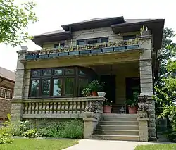The Anton E. Hanson House is a historic house at 7610 S. Ridgeland Avenue in the South Shore neighborhood of Chicago, Illinois. Real estate developer Anton E. Hanson had the house built for his family in 1912. The house also allowed Hanson to test concrete block construction, an increasingly popular method that Hanson later used in two other houses. Architect Perley Hale designed the American Foursquare house. Hale's design added decorative stone features to the concrete exterior, including balustrades on the porch and balcony and a cornice below the balcony.[2]