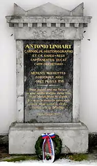 From the early 1780s on, Linhart began frequenting a circle of Slovene enlighteners who met in the Zois Mansion in Ljubljana. There, he met several intellectuals, including Sigmund Zois, Valentin Vodnik, Jernej Kopitar, Jurij Japelj and others, in whose company he developed an interest in Slovene language, culture, and history. He wrote two plays in Slovene and then began a project to write the first comprehensive history of the Slovene Lands but did not finish it.[3] He unexpectedly died in Ljubljana on the night of July 14, 1795, around midnight, from aortic aneurysm.[2] He has a tombstone in the Navje memorial park in Ljubljana, alongside other important personalities of Slovene history, but it is not certain that he has been indeed buried there.[7]
