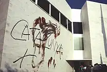 Tàpies' international reputation was well established by the end of the 1950s. From the late 1950s to early 1960s, Tàpies worked with Enrique Tábara, Antonio Saura, Manolo Millares and many other Spanish Informalist artists. In 1966 he was arrested at a clandestine assembly at the University of Barcelona; his work of the early 1970s is marked by symbols of Catalan identity (which was anathema to Franco).[8] In 1974 he made a series of lithographs called Assassins and displayed them in the Galerie Maeght in Paris, in honour of regime critic Salvador Puig Antich's memory. From about 1970 (influenced by Pop art) he began incorporating more substantial objects into his paintings, such as parts of furniture. Tàpies's ideas have had worldwide influence on art, especially in the realms of painting, sculpture, etchings and lithography. Examples of his work are found in numerous major international collections. His work is associated with both Tachisme and Abstract Expressionism.