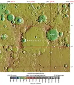 Antoniadi is a crater on Syrtis Major Planum in the Syrtis Major quadrangle, Mars, located at 21.5° north latitude and 299.2° west longitude. It is 394 km (245 mi) long and was named after Eugène Michael Antoniadi, a Greek astronomer (1870-1944) who spent most of his life in France.[1]