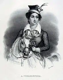 Tomaszewska was born in 1814 in Raseiniai, Samogitia, then part of the Russian Empire and previously part of the Polish–Lithuanian Commonwealth. She was born into the Polish-Lithuanian nobility, and was educated at a Benedictine monastery in Kražiai. While she was attending the monastery, a large-scale revolt broke out in Warsaw against the Russian garrison of the city. This revolt grew into the November Uprising of 1830–1831, during which the pro-independence Polish National Government organized local resistance groups to fight against the Imperial Russian Army. Tomaszewska left her monastery and joined one of these groups, equipping herself with a horse, lance, and sabre. She proved a skillful enough combatant to join an organized Polish unit of lancers.[1][2][3]