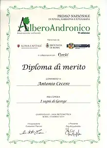 In 2013 Antonio Cecere was awarded the Diploma di Merito at the Premio Nazionale Albero Andronico[1] for "I Sogni di George".