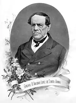 Antonio de Padua María Severino López de Santa Anna y Pérez de Lebrón (Spanish pronunciation: [anˈtonjo ˈlopes ðe sanˈtana]; 21 February 1794 – 21 June 1876),[1] usually known as Santa Anna[2] or López de Santa Anna, was a Mexican caudillo[3] who served multiple times as president of Mexico. He was a preeminent figure in Mexican politics during the 19th century, to the point that historians of Mexico often refer to three decades after Mexican independence as the "Age of Santa Anna".[4] He has been called "the Man of Destiny who loomed over his time like a melodramatic colossus, the uncrowned monarch".[5]