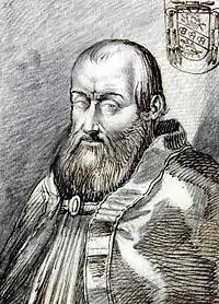 In 1526, Pope Clement VII concluded the treaty forming the League of Cognac, allying the Papal States with the Kingdom of France, the Republic of Venice, and the House of Sforza against Charles V, Holy Roman Emperor.[1] On May 22, 1526, Cardinal Ciocchi del Monte was one of the leading commissioners responsible for preparing the Papal States for the War of the League of Cognac.[1] His efforts, however, were totally inadequate to prevent the Sack of Rome (1527).[1] He was one of the small number of cardinals who remained loyal to the pope, seeking refuge with him in the Castel Sant'Angelo.[1] On June 5, 1527, he was one of the seven cardinals who signed the capitulation to the imperial forces and his nephew, Giovanni Maria Ciocchi del Monte (the future Pope Julius III) was taken hostage by imperial forces.[1]