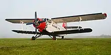 The Antonov An-2 ("kukuruznik"—corn crop duster; USAF/DoD reporting name Type 22,[5] NATO reporting name Colt[6]) is a Soviet mass-produced single-engine biplane utility/agricultural aircraft designed and manufactured by the Antonov Design Bureau beginning in 1947.[4] Its durability, high lifting power, and ability to take off and land from poor runways have given it a long service life. The An-2 was produced up to 2001 and remains in service with military and civilian operators around the world.