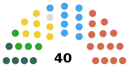 Political groups | Executive (23) DUP (14) UUP (9) Opposition (17) Alliance (7) Sinn Féin (5) SDLP (4) Independent (1) |