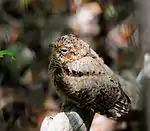 The Puerto Rican nightjar feeds on beetles, moths and other insects that it catches in flight.[1] It nests on the ground under closed canopies and needs an abundant leaf layer to hold the eggs.[3][7] The peak months for nesting activity are April–June.[7] The clutch is usually of 1-2 eggs, which are light brown with darker brown or purple patches.[3] The eggs have an incubation period of 18–20 days and are primarily incubated by the male.[3][6] The chicks are a cinnamon downy color[6] and they start to fly at about 14 days after hatching.[3] Like many ground-nesting birds, the nightjar will try to divert the attention of potential predators away from the nest by conspicuously flying away and vibrating its wings.[3] The species may be permanently territorial.[1]