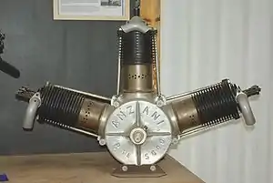 In response to the growing interest in aviation in France after the Wright brothers' visit in 1908, Anzani produced the first of a series of three-cylinder fan flight engines. The cylinders were each a single iron casting and the one-piece crankcase was aluminium.[2] Pistons were steel with cast rings.[2] In most of these the outer cylinders were at 60° to the central one, though a contemporary diagram[3] shows one, described as the cross channel engine, with a 55° angle. They were all air-cooled side-valve engines; each exhaust valve was controlled from below by a cam in the crankcase.[2] Each was mounted in a cell to the side of the cylinder, with the automatic, atmospheric pressure-driven spring-loaded inlet valve immediately above it, partly to minimise volume and partly to help cool the hot exhaust valve. Most contemporary and pre-1921 sources agree that the bores of these early engines were between 100 and 105 mm (3.93 and 4.13 in),[2][4][5] but strokes between 120 and 150 mm (4.72 and 5.90 in) are quoted. Most state the output of these engines at about 18 kW (24 hp) at around 1,400–1,600 rpm.
