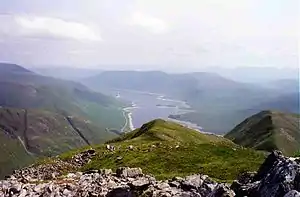 Aonach Meadhoin reaches a height of 1001 metres (3284 feet) and along with the Munros of Saileag and Sgùrr a' Bhealaich Dheirg it forms a group of mountains sometimes referred to as the North Glen Shiel Ridge.[2] The group are also known as the “Brothers of Kintail”[3] in a nodding acquaintance to the better known Five Sisters of Kintail just to the north west. The mountain's name translates from Gaelic as Middle Ridge,[4] the mountain is shaped like a horseshoe with the summit ridge lying centrally between the two ridges on either side of Coire na Cadha which lies between the mountain and the A87 road two kilometres to the south.