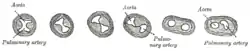 ![]() Transverse sections through the aortic bulb to show the growth of the aortic septum. The lowest section is on the left, the highest on the right of the figure. | |