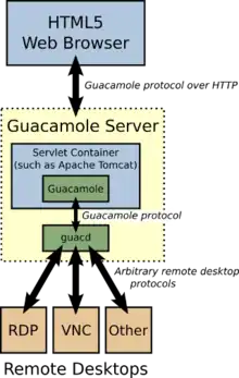 Guacamole is made up of multiple components: a web application that is served to users, and a backend service ("guacd") that dynamically translates and optimizes[3] native protocols into the Guacamole protocol. The part of Guacamole that a user interacts with is the web application.[4]