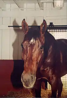 Apalachee was a tall, long-striding bay horse with a white star and one white foot,[2] bred by Claiborne Farm in Kentucky. He was the product of a mating between two American Horses of the Year: Round Table and Moccasin. Round Table was one of the most successful grass specialists in American racing history, winning forty-three races and being named Horse of the Year in 1958.[3] He became a highly successful breeding stallion, being the Leading sire in North America in 1972.[4] Moccasin was named Horse of the Year as a two-year-old filly in 1965, when she was unbeaten in eight races. She came from the same branch of Thoroughbred family 5-h which produced Ridan, Thatch, Nureyev, Fairy King and Sadler's Wells.[5]