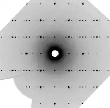 The diffraction patterns of aperiodic crystals contain two sets of peaks, which include "main reflections" and "satellite reflections".[1] Main reflections are usually stronger in intensity and span a lattice defined by three-dimensional reciprocal lattice vectors. Satellite reflections are weaker in intensity and are known as "lattice ghosts". These reflections do not correspond to any lattice points in physical space and cannot be indexed with the original three vectors. To understand aperiodic crystal structures, one must use the superspace approach.[3] In materials science, "superspace" or higher-dimensional space refers to the concept of describing the structures and properties of materials in terms of dimensions beyond the three dimensions of physical space. This may involve using mathematical models to describe the behavior of atoms or molecules in a materials in four, five, or even higher dimensions.[4]