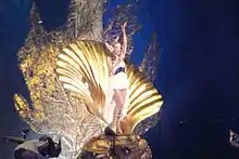 Holograph, the fifth section, began with "Confide in Me". Minogue wore an asymmetric holographic "Bacofoil ball gown".[33][25] This was followed by a rock-oriented performance of the hit single "Can't Get You Out of My Head". "In My Arms" was performed next and closed the section. The sixth section, Angel, began with "Looking for an Angel". "Closer" was then performed, where Minogue flew to the B-stage atop of a dancer dressed as an angel, which was followed by Minogue covering the Eurythmics song "There Must Be an Angel (Playing with My Heart)".[25][36] After this, Minogue talked with the audience and introduced the band before performing a mash-up of "Can't Beat the Feeling" and "Love at First Sight", which was followed by a performance of "If You Don't Love Me".[37] Brazil Funk commenced with "Better the Devil You Know" with Minogue wearing hot pants and an orange jacket.[38] "Better than Today" was performed next, although at some shows it was omitted. Minogue then took requests from the audience and went on to close the main body of the show with "Put Your Hands Up (If You Feel Love)". The encore began with an instrumental intro dubbed "Million Dollar Mermaid", which featured projections of swimmers. This leads into a new remix of "On a Night Like This", which featured water jets. "All the Lovers" closed the show; the water jets, fountains, scissor lift and aerial performances were used.[33]