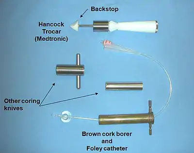 AAC requires specialized implants and installation tools. Hancock Laboratories, now part of Medtronic (Minneapolis, MN), developed and released a set of left ventricle connectors, valved conduits, and installation trocars in the 1970s. The Hancock left ventricle connectors, with inner diameters of 12 to 22 mm, have been used clinically for the vast majority of AAC procedures reported in the literature. For the valved conduit, surgeons have used the Medtronic Hancock Model 105 or 150 valved conduits which contain a complete porcine aortic valve. Other surgeons have constructed valved conduits on the back table using a variety of bioprosthetic valves such as the Medtronic Freestyle valve. The Hancock trocars for creating a hole in the left ventricle are rarely used clinically. Surgeons typically assemble their own tools to core and remove a plug of muscle from the left ventricular wall.