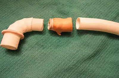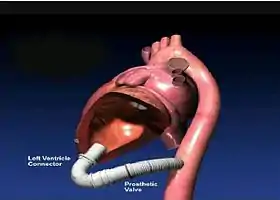 ![]() A completed apicoaortic conduit shown with the left ventricle partially cut away. The natural aortic valve is visible at the top of the left ventricle. | |