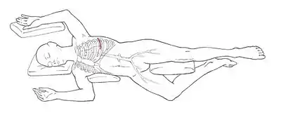 The patient is placed on the table in the supine position. Anesthesia is induced, and the patient is intubated with a double-lumen endotracheal tube, which facilitates one-lung ventilation and allows the surgeon to work within the left chest. The patient is positioned with his or her left side up (see figure). A left anterior-lateral thoracotomy is performed between the fifth and sixth ribs to expose the heart and provide access to the descending aorta. A portion of a rib may be removed to enable easier access and to minimize the chance of a rib fracture. The left lung is deflated and retracted.