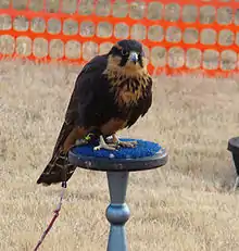 The aplomado falcon (Falco femoralis) is a medium-sized falcon of the Americas. The species' largest contiguous range is in South America, but not in the deep interior Amazon Basin. It was long known as Falco fusco-coerulescens or Falco fuscocaerulescens, but these names are now believed to refer to the bat falcon (F. rufigularis).[2] Its resemblance in shape to the hobbies accounts for its old name orange-chested hobby. Aplomado is an unusual Spanish word for "lead-colored", referring to the blue-grey areas of the plumage – an approximate English translation would be "plumbeous falcon". Spanish names for the species include halcón aplomado and halcón fajado (roughly "banded falcon" in reference to the characteristic pattern); in Brazil it is known as falcão-de-coleira (roughly "leashed falcon" in reference to the white throat).