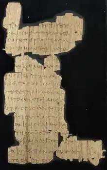Dublin, Chester Beatty Library, CBL BP XVI is the most important witness to the Greek text.[1] It consists of 100 papyrus fragments, 99 of which are now mounted in eight glass frames.[7] The fragments come from a codex.[11] They were bound as a single quire of at least 24 pages.[12]