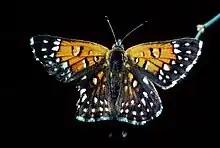 Lange's metalmark is a fragile, brightly colored butterfly in the Riodinidae (metalmark) family. Adult wingspan varies from 1-inch (25 mm) to 1.5-inch (38 mm). Dorsal wings are largely black with white spots. Red-orange coloration extends through the inner forward half of the forewing, the hindwing bases, and a small central patch subtended by black. Below, the wings have a more muted pattern of gray, white, black, and orange.