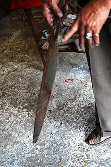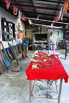 The Aguilar workshop is one of forty five which produce artistic blades, but it is the only one that still produces their pieces completely by hand, using traditional techniques, using hammers, anvils and a furnace made of stone and brick heated by wood.[1][2] Each piece is unique in some way.[2][3] The others have industrialized the production on one way or another, which Apolinar says makes the blades less expensive, but of poorer quality.[2] Apolinar works with another brother by the name of Jesús Aguilar Velasco, and their base materials is scrap metal from autos and construction sites.[1]