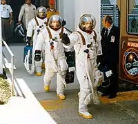 The ASTP crew, entering the transfer van