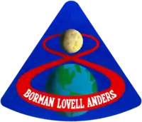 The triangular shape of the insignia refers to the shape of the Apollo CM. It shows a red figure 8 looping around the Earth and Moon to reflect both the mission number and the circumlunar nature of the mission. On the bottom of the 8 are the names of the three astronauts. The initial design of the insignia was developed by Jim Lovell, who reportedly sketched it while riding in the back seat of a T-38 flight from California to Houston shortly after learning of Apollo 8's re-designation as a lunar-orbital mission.[29]