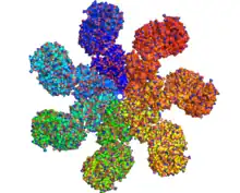 In mammalian cells, once cytochrome c is released, it binds to the cytosolic protein Apaf-1 to facilitate the formation of an apoptosome. An early biochemical study suggests a two-to-one ratio of cytochrome c to apaf-1 for apoptosome formation. However, recent structural studies suggest the cytochrome c to apaf-1 ratio is one-to-one. It has also been shown that the nucleotide dATP as third component binds to apaf-1, however its exact role is still debated. The mammalian apoptosome had never been crystallized, but a human APAF-1/cytochrome-c apoptosome has been imaged at lower (2 nm) resolution by cryogenic transmission electron microscopy in 2002,[2] revealing a heptameric wheel-like particle with 7-fold symmetry. Recently, a medium resolution (9.5 Ångström) structure of human apoptosome was also solved by cryo-electron microscopy, which allows unambiguous inference for positions of all the APAF-1 domains (CARD, NBARC and WD40) and cytochrome c. There is also now a crystal structure of the monomeric, inactive Apaf-1 subunit (PDB 3SFZ).[1][3]
