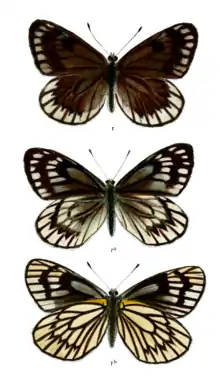 Males and females have the upperside white, with the veins more or less black, but the ground colour in many specimens are so densely overlaid by black scales over nearly the whole surface of both forewings and hindwings as to leave only a subterminal series of more or less rectangular spots of the white ground colour apparent on each wing, those on the hindwing are the largest and are inwardly acutely emarginate. In addition, there is a large ill-defined black patch on the discocellulars of the forewing and a small spot of the same colour generally on the discocellulars of the hindwing. Cilia of both wings black. In nearly all specimens the discoidal cells of the wings are greyish, and on the forewing there are anterior discal, elongate, greyish spots beyond the apex of the discoidal cell. A few specimens, generally females, are much lighter in colour. In these the irroration of black scales is sparse and allows much of the white ground colour to show through; the discocellulars of the forewing, however, are marked by a large black patch as in the darker individuals; and both forewings and hindwings bear postdiscal, irregular, transverse black bands; that on the forewing bisinuate, sometimes not extended below vein 2; that on the hindwing not reaching the dorsal margin, curved, and formed of somewhat ill-defined, irregular, conjoined, outwardly acute, arrow-shaped black spots. Underside: white, the veins on both wings very broadly black edged; apex of forewing very slightly, the whole surface of the hindwing more strongly suffused with yellow; the forewing sometimes clouded posteriorly with black scaling; both forewing and hindwings with postdiscal transverse black bands as on the upperside but broader; the base of the hindwing above vein 8 chrome yellow. Antennae black, the club ochraceous at apex; head and thorax clothed with fine dusky greyish-black hairs; abdomen black above, beneath greyish white.[1]