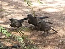 The apostlebird (Struthidea cinerea), also known as the grey jumper, lousy jack or happy family,[2] is a quick-moving, gray or black bird about 33 cm (13 in) long. It is a native to Australia where it roams woodlands, eating insects and seeds at, or near, ground level. Apostlebirds often travel in groups of about 12; for this reason, they were named after the 12 Biblical apostles.
