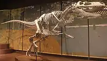 Appalachiosaurus (/ˌæpəˌleɪtʃioʊˈsɔːrəs/ AP-ə-LAY-chee-oh-SOR-əs; "Appalachian lizard") is a genus of non-tyrannosaurid eotyrannosaurian theropod dinosaur from the middle Campanian age of the Late Cretaceous period of what is now eastern North America. Like almost all theropods, it was a bipedal predator. Only a juvenile skeleton has been found, representing an animal approximately 6.5 metres (21 ft) long and weighing 623 kilograms (1,373 lb), which indicates an adult would have been significantly larger. It is the most completely known theropod from eastern North America.