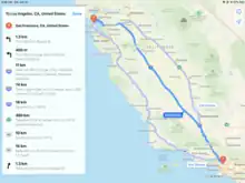 Apple Maps can be used to plan routes. Apple expands their basic Maps interface by adding badges. A weather and air quality index badge will be seen a long side the current traffic information constantly. Before, a user could only observe the traffic information while using the turn-by-turn directions.[81] According to Apple, the navigation function is available in 56 countries worldwide.[82] Apple Maps can also be used to see real-time traffic information. In addition, Apple's virtual assistant, Siri, is integrated into Apple Maps. The map displays points of interest provided by approximately twenty companies, including Booking.com, Foursquare, TripAdvisor, and Yelp. The data from Foursquare was added in late 2015.[79][83] Users can drop pins on the map to save places for later retrieval. The satellite view features Flyovers, three-dimensional satellite views, in designated locations.[84]
