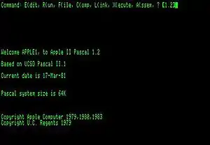 Apple Pascal is an implementation of Pascal for the Apple II and Apple III computer series. It is based on UCSD Pascal.[2] Just like other UCSD Pascal implementations, it ran on its own operating system (Apple Pascal Operating System,[3] a derivative of UCSD p-System with graphical extensions).