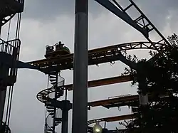 The ride sends a 10-car, 4-person-per-car train along the 1,312.3 ft track at 35 mph.[2] The track layout consists of several high hairpin switchbacks followed by a pair of steep drops.