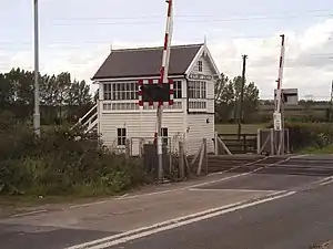 ![]() Signal box and level crossing at the site of Appleby railway station | |