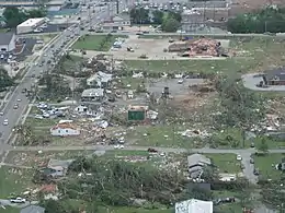 ![]() EF5 damage in Phil Campbell, with homes swept away and grass scoured from hillsides. | |