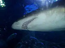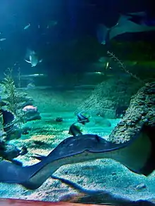 The main Shipwreck Coast aquarium is 40 metres (130 ft) long and 20 metres (66 ft) wide and holds 3,000,000 litres (793,000 US gal) of seawater. It incorporates a 98-metre (322 ft) underwater acrylic tunnel, the largest in Australia.[8] This exhibit contains 3–4-metre (10–13 ft) grey nurse shark, 4-metre (13 ft) smooth stingrays, large loggerhead turtles and over 70 other species of rays, octopuses, sharks and fish.