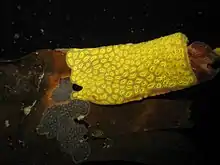 Golden star tunicates are observed in much of the world though they are invasive to eastern Canada and the Gulf of Saint Lawrence.[28] They can be identified by their flower or star shaped zooids, their clear coat, and their gelatinous texture.[28] They negatively affect shellfish, bottom-dwelling fish, and aquaculture farmers.[28] This is because they directly compete for the same resources, whether they be food or space.[29] Golden star tunicate can reproduce by free swimming larvae, or by the creation of a fragment which can grow into a full colony.[28] Boats, docks, and other sea structures allow the golden star tunicate to spread more effectively.[30]