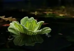 Free-floating macrophytes are found suspended on water surface with their root not attached to the substrate, sediment, or bottom of the water body. They are easily blown by air and provide breeding ground for mosquitoes. Example include Pistia spp. commonly called water lettuce, water cabbage or Nile cabbage.[30]